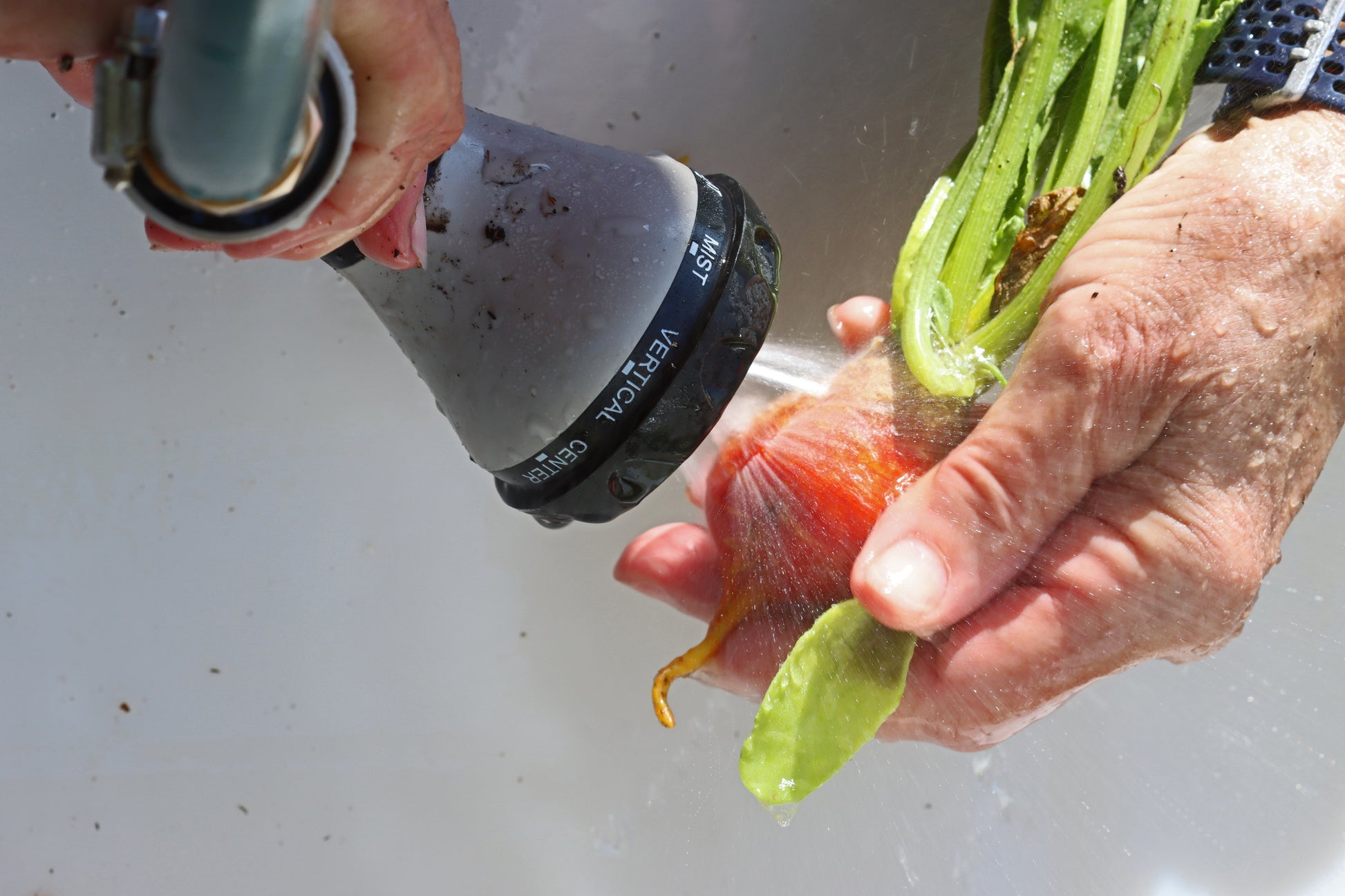 Close up view of gardener washing freshly picked beets