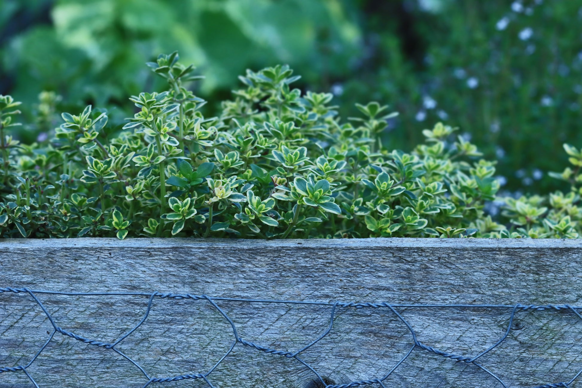 Lemon thyme behind raised garden bed