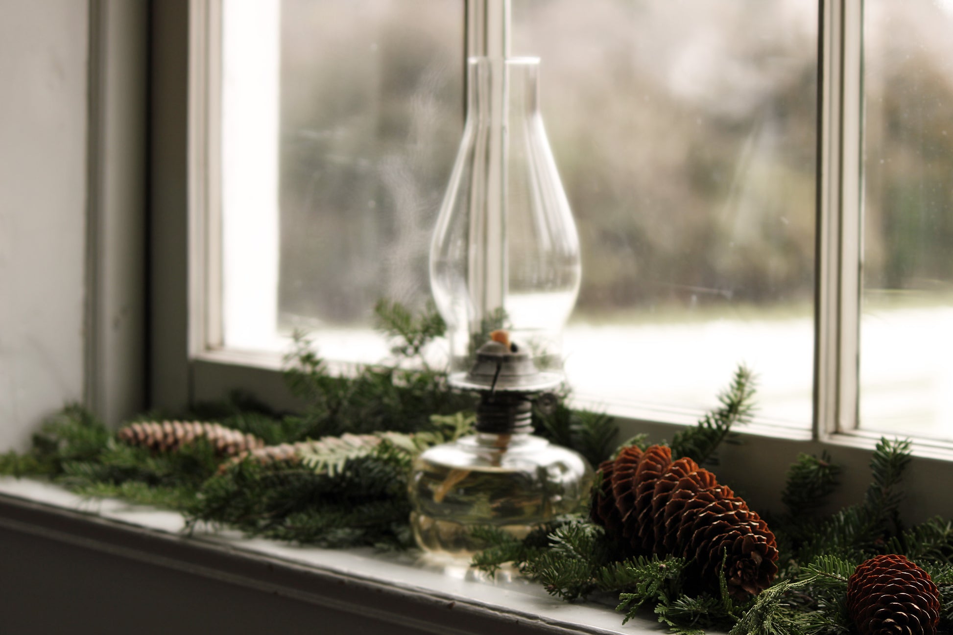 Vintage oil lamp in windowsill with natural evergreen boughs and pinecones.
