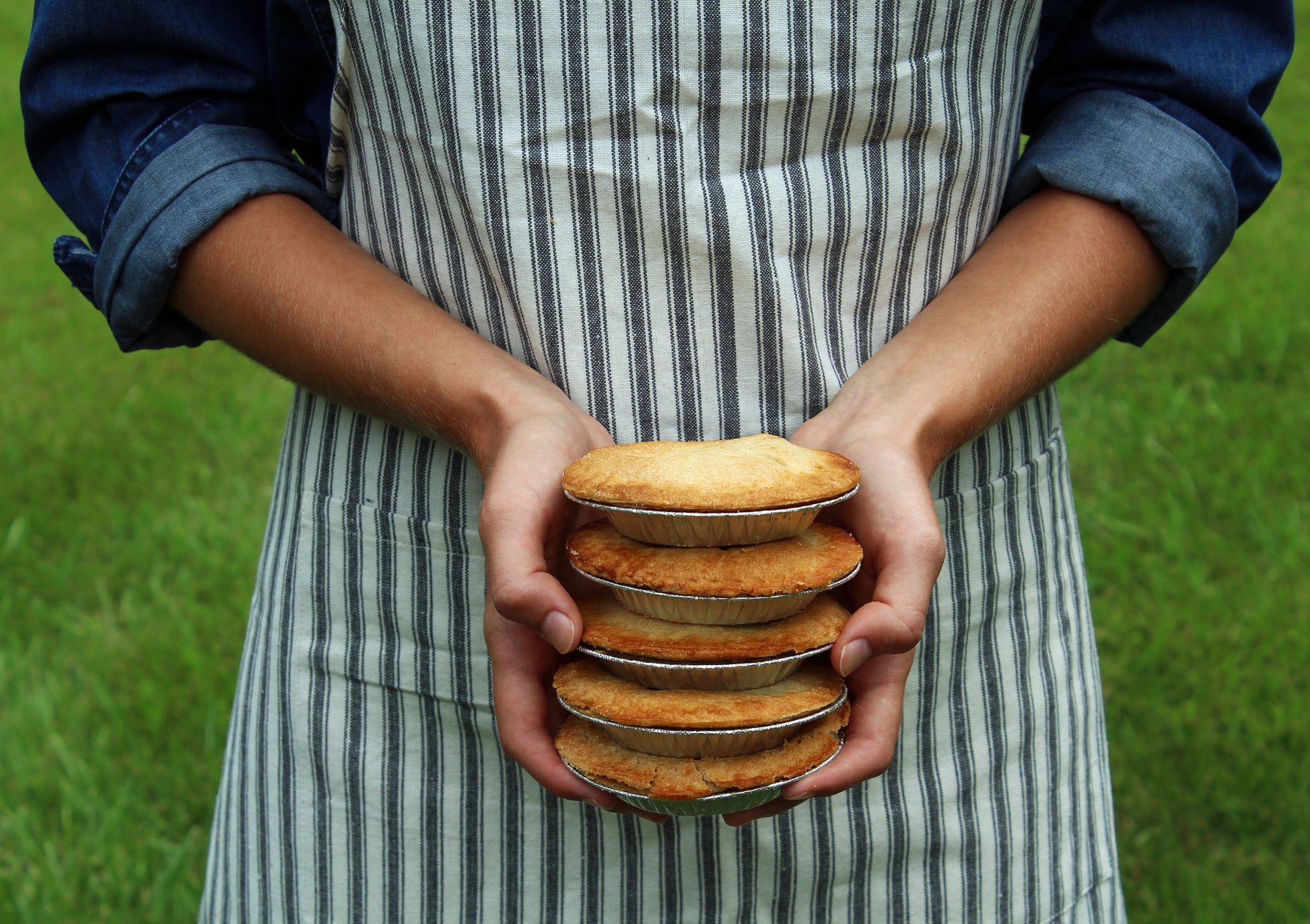Female midsection wearing apron holding tiny pies.