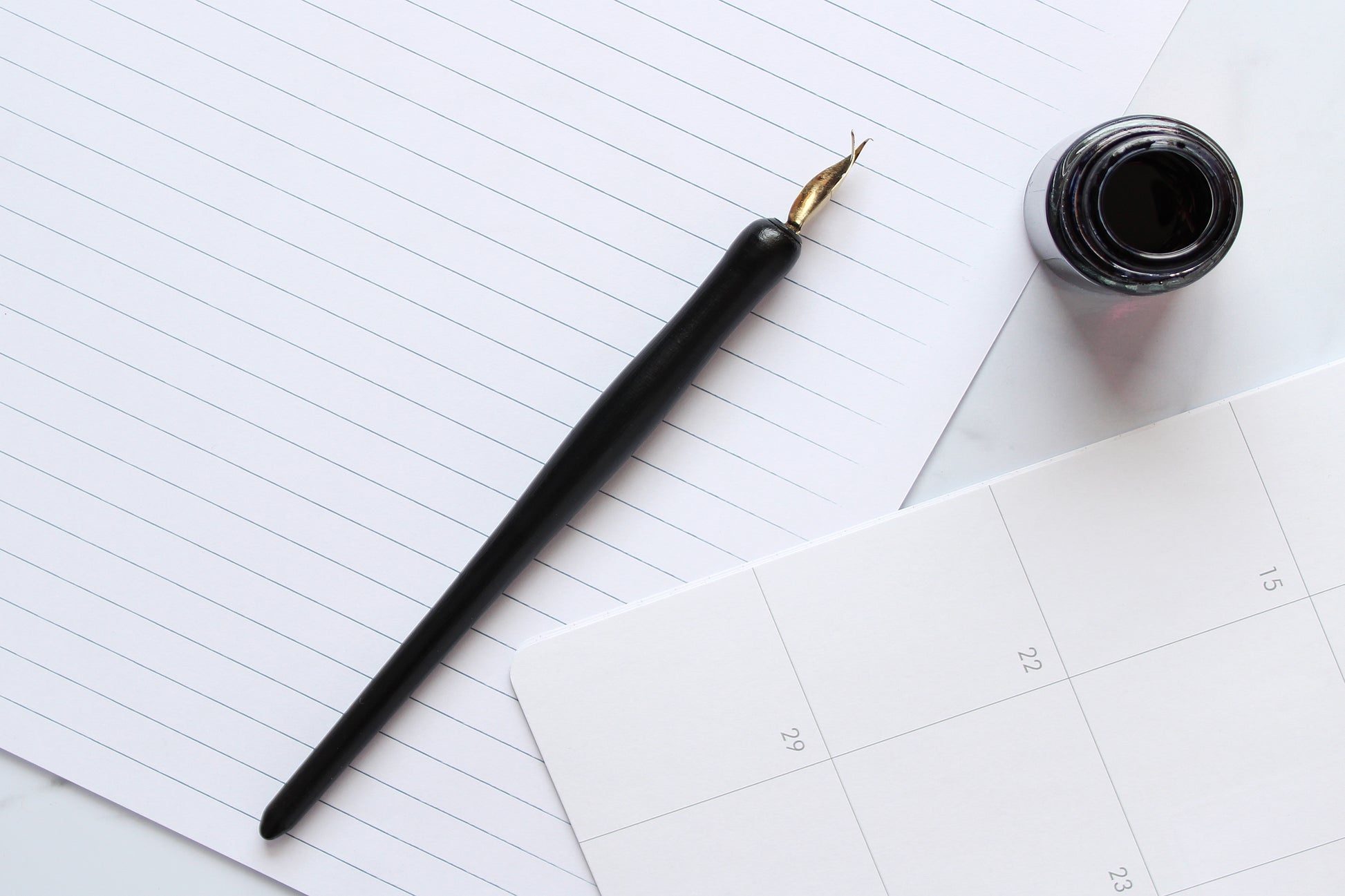 Above flat lay view of a calendar, ink bottle, pen, and lined paper.