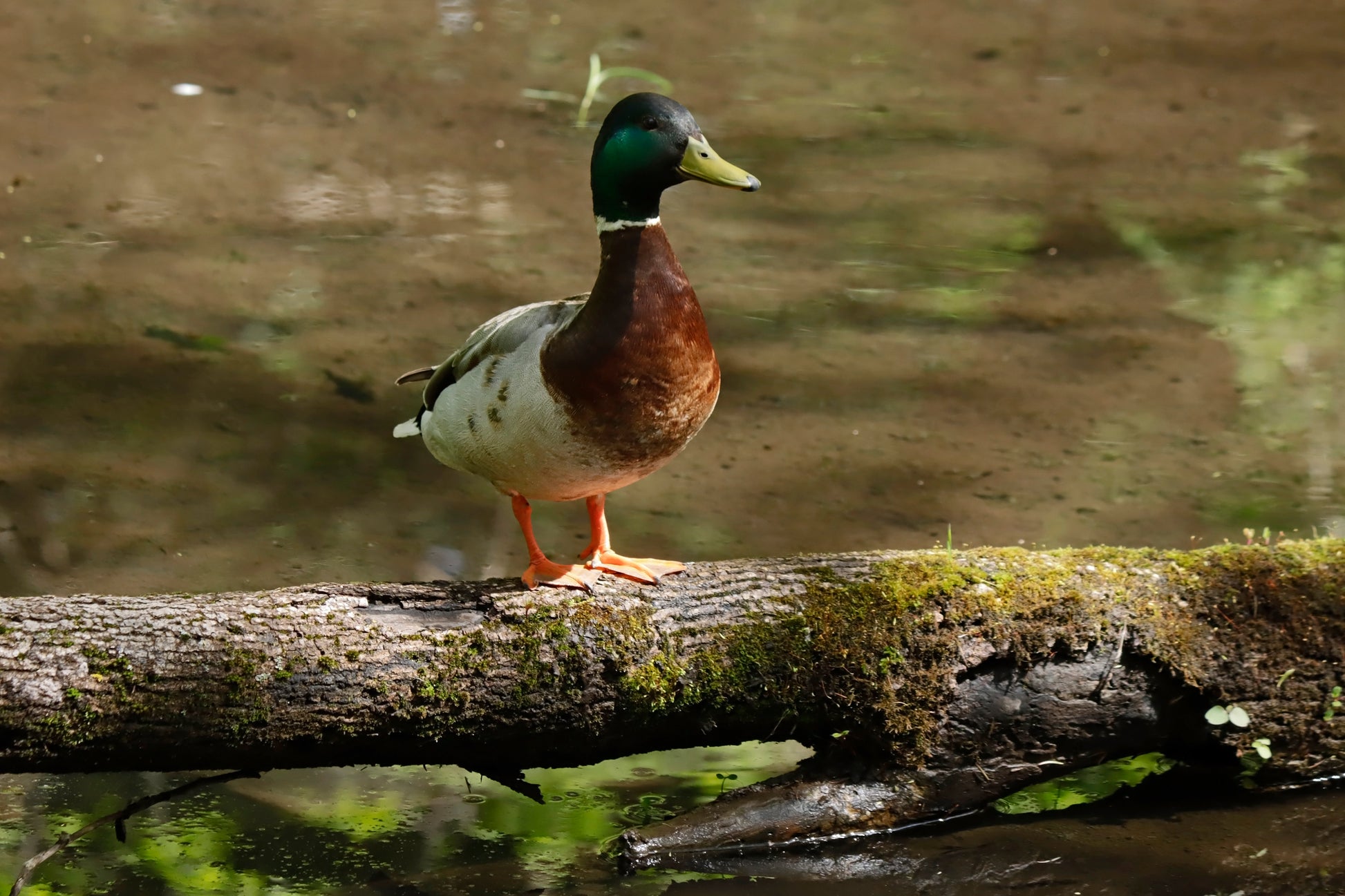 Male mallard duck resting on a log in a pond. Retzer Nature Center