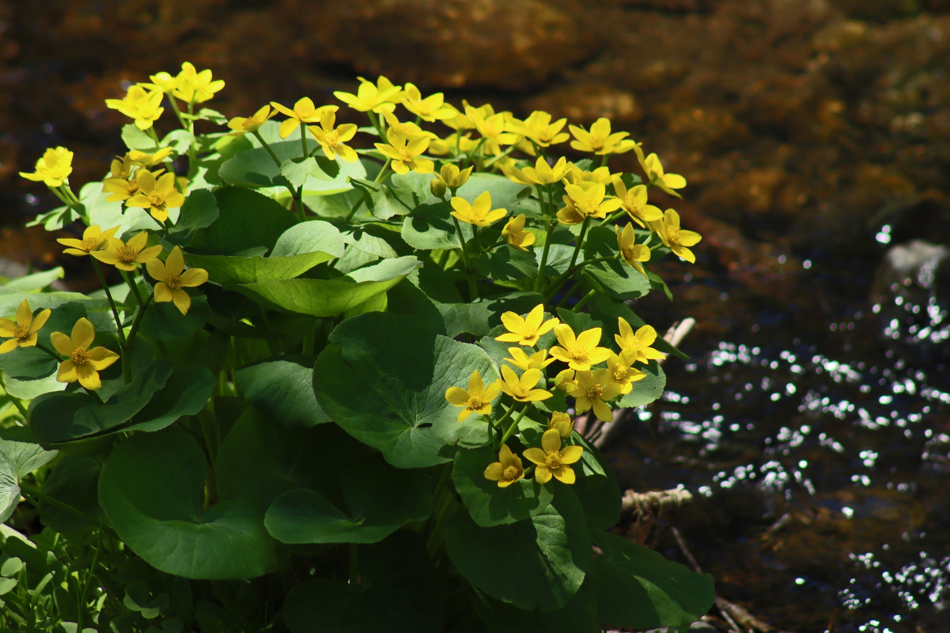 Marsh-marigolds growing alongside a sparkling stream.