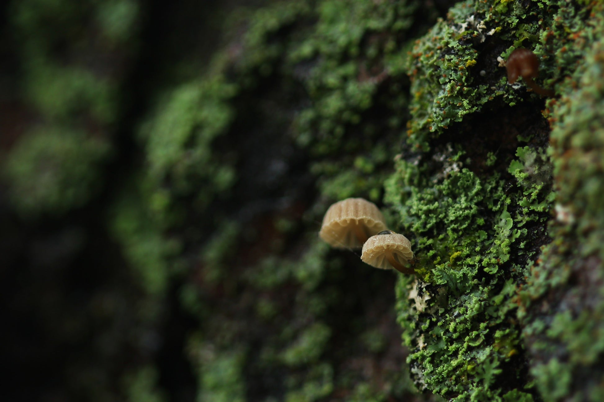 Tiny umbrella shaped mushroom growth on the side of a maple tree.