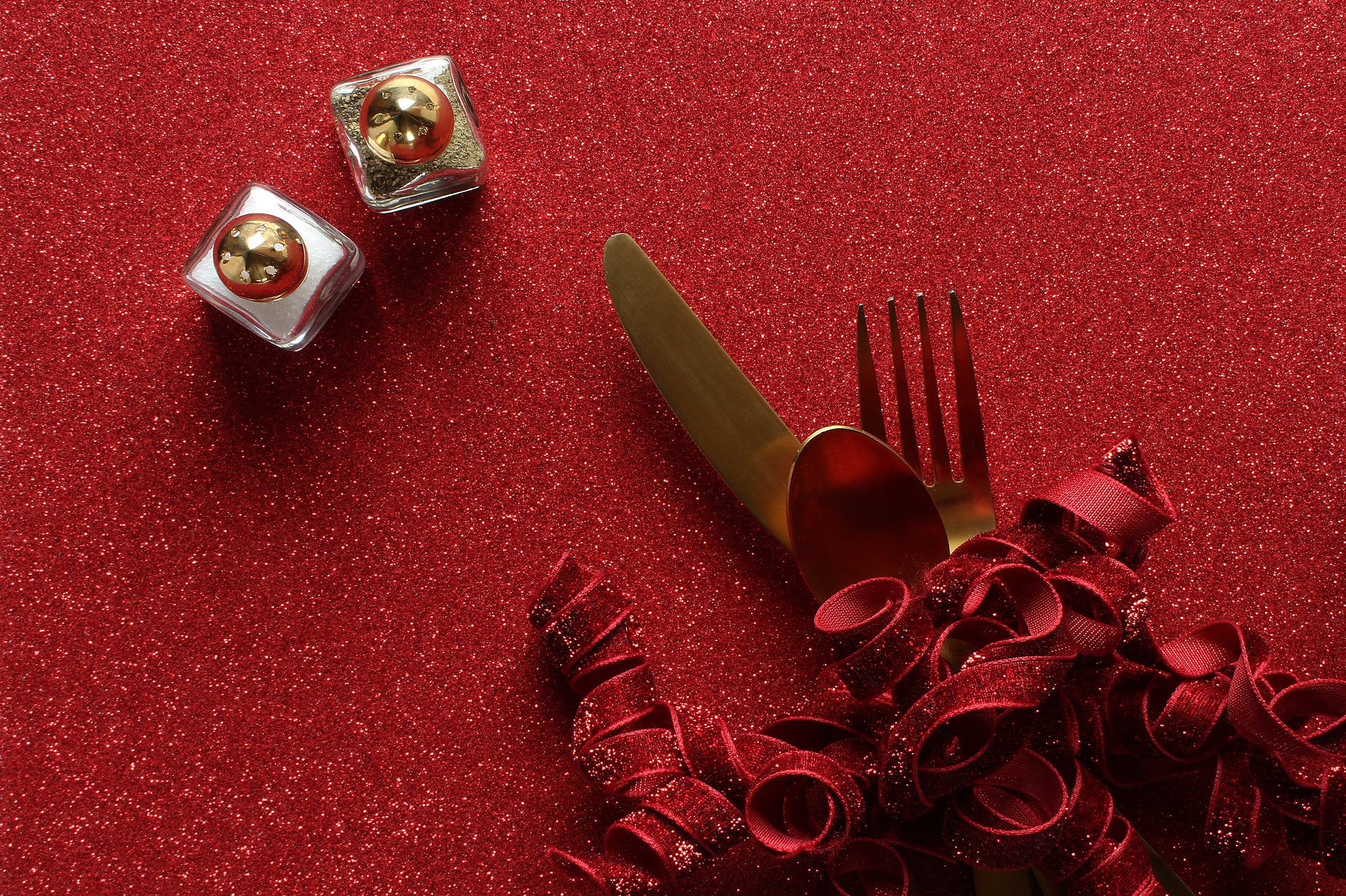 Above close up view of a red background with salt and pepper with cutlery and decorations.