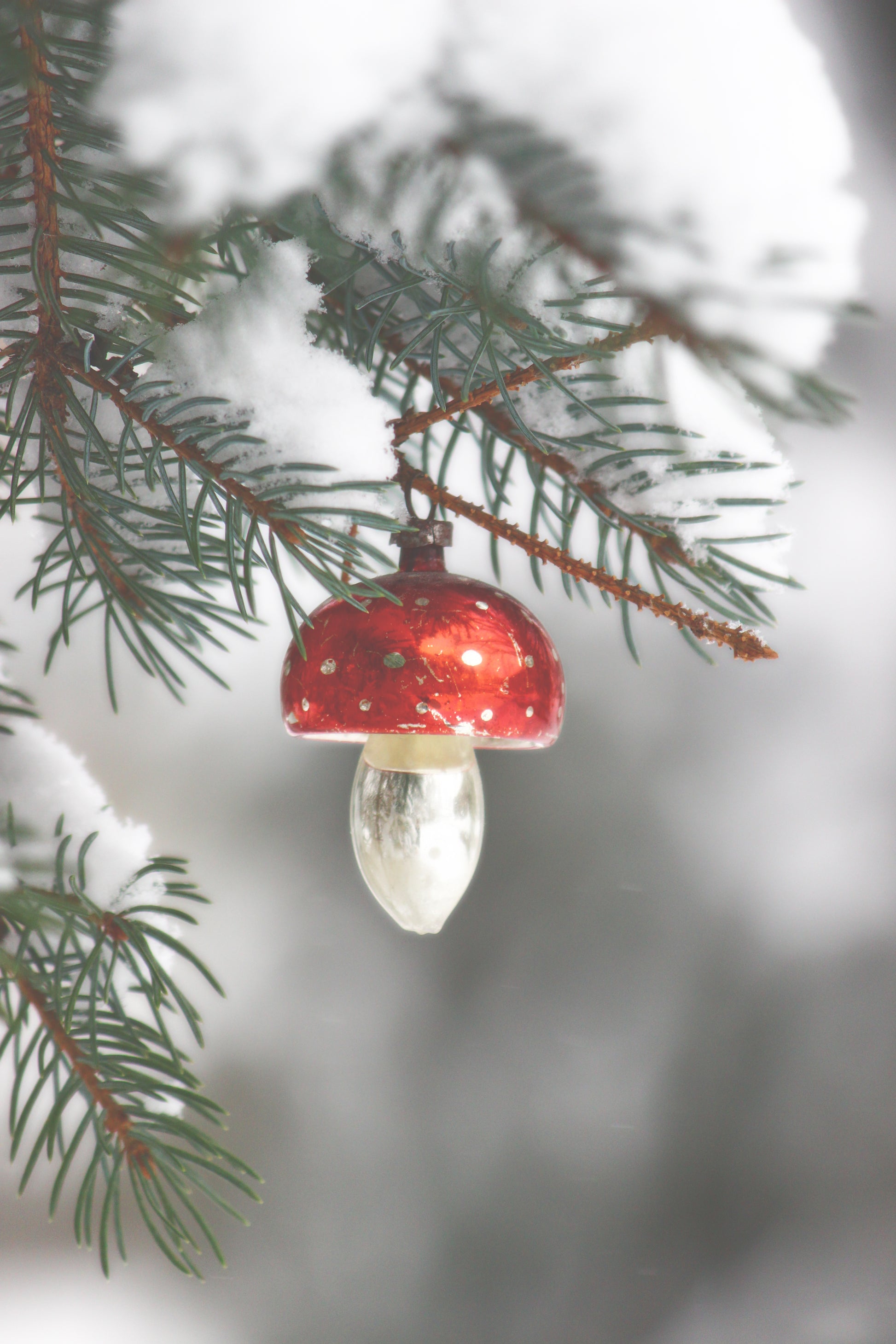 Vintage mushroom ornament on an evergreen tree outdoors with snow covered branches
