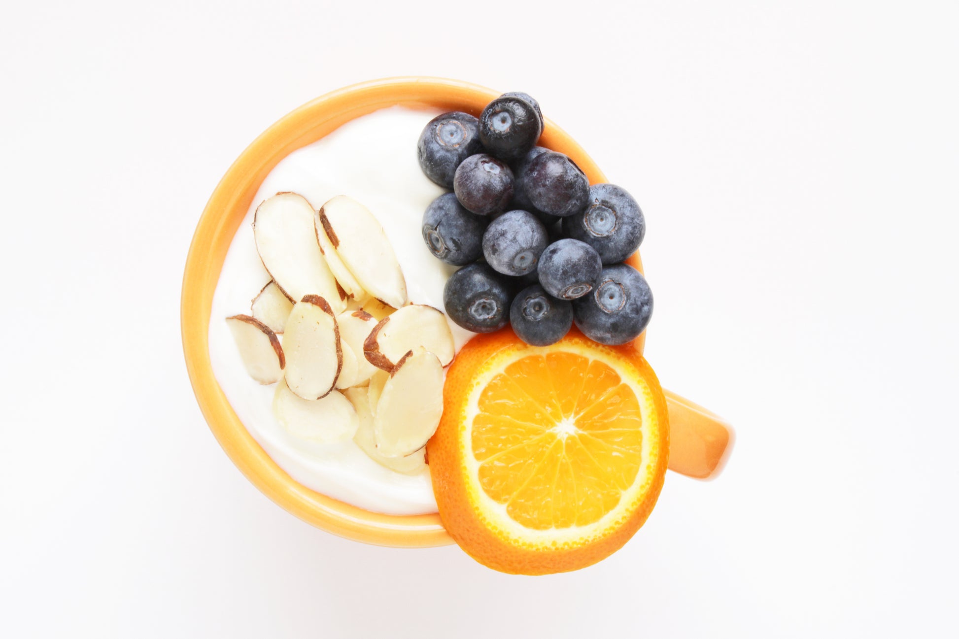 Above close up view of orange cup filled with yogurt, blueberries, almonds and orange slice.