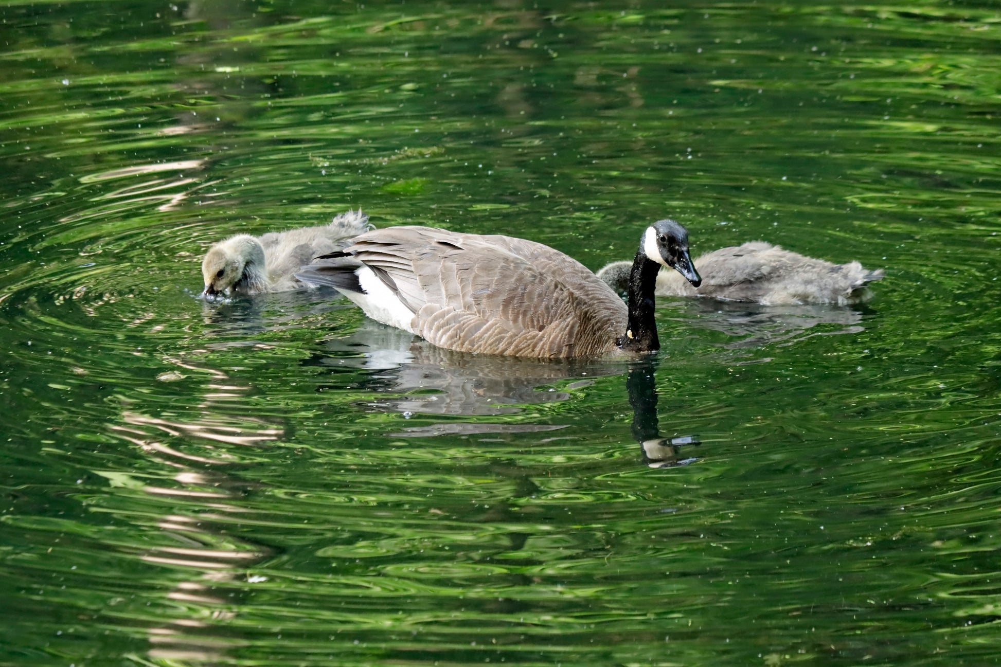 Mother with her goslings at feeding time in the pond. Paradise Springs State Park.