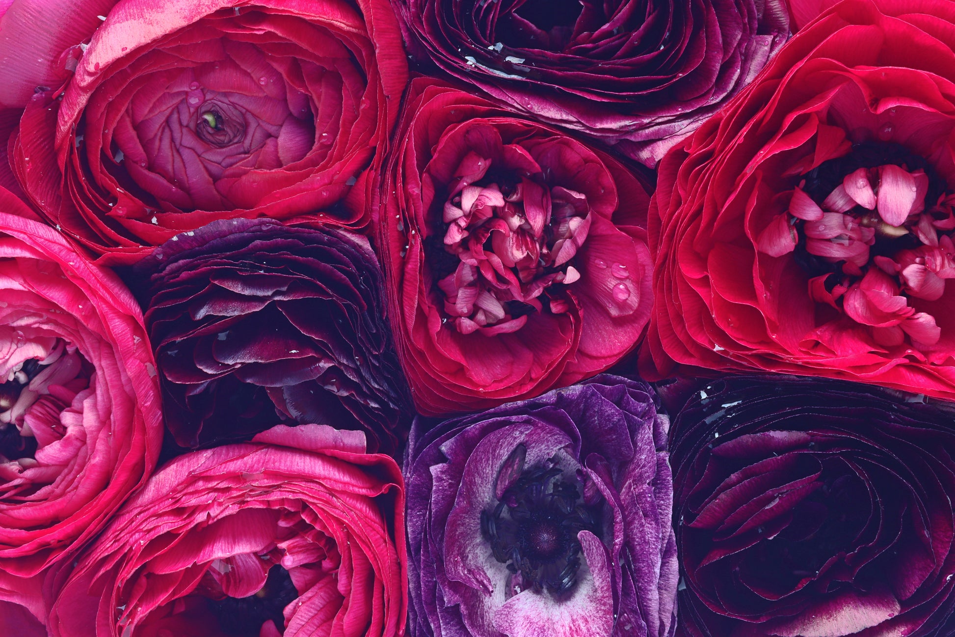 Full frame close up view of bright pink and deep purple ranunculus flowers