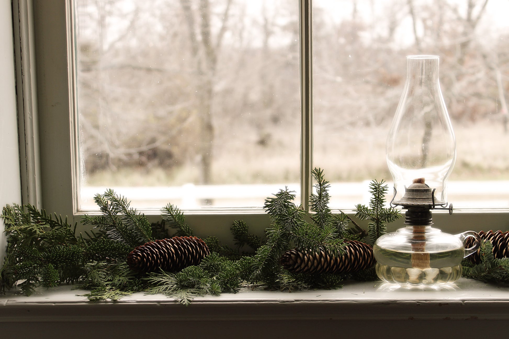Oil lamp on the windowsill with Christmas evergreens.