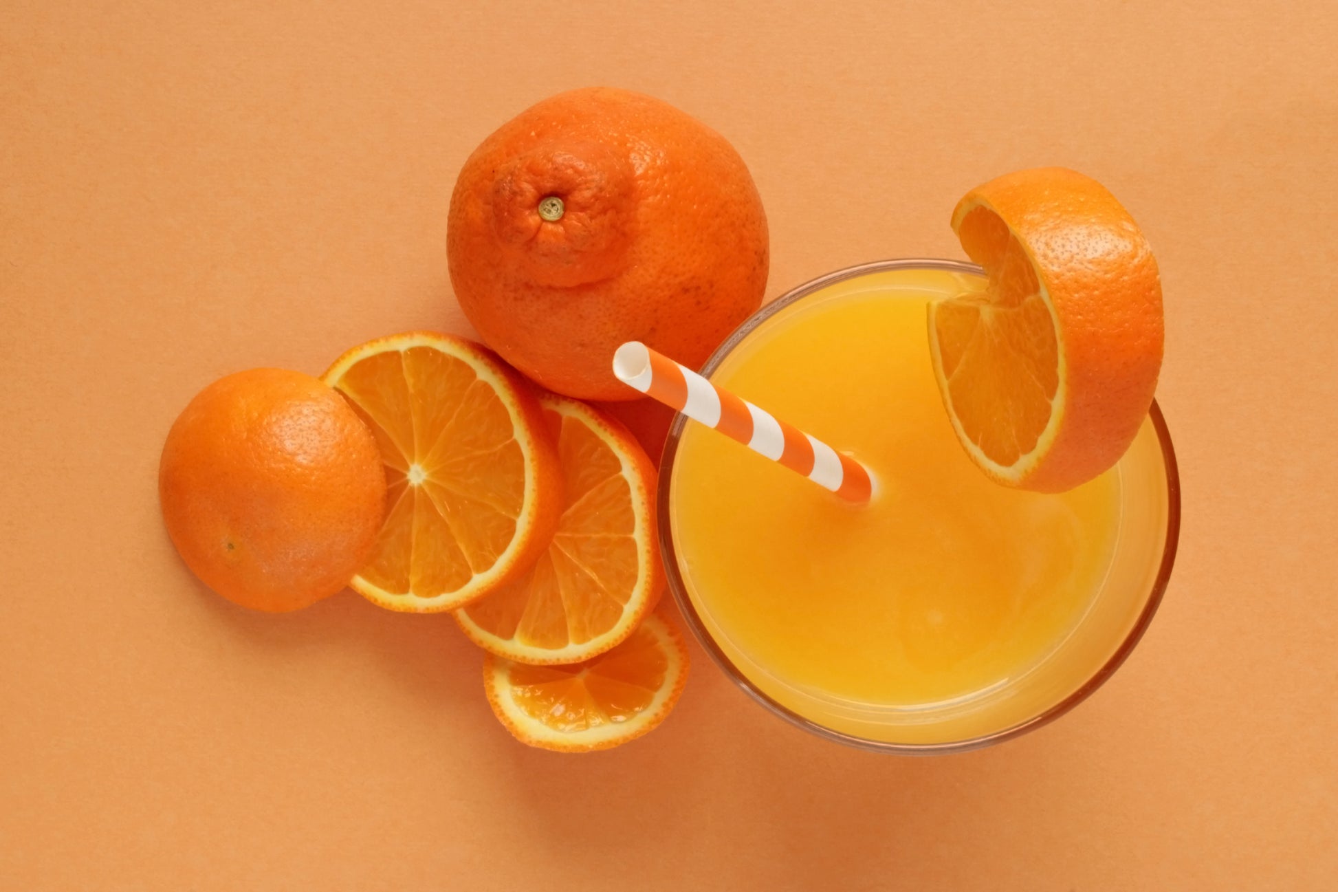 Above view of orange juice concept with oranges, glass of juice and straw on orange background.