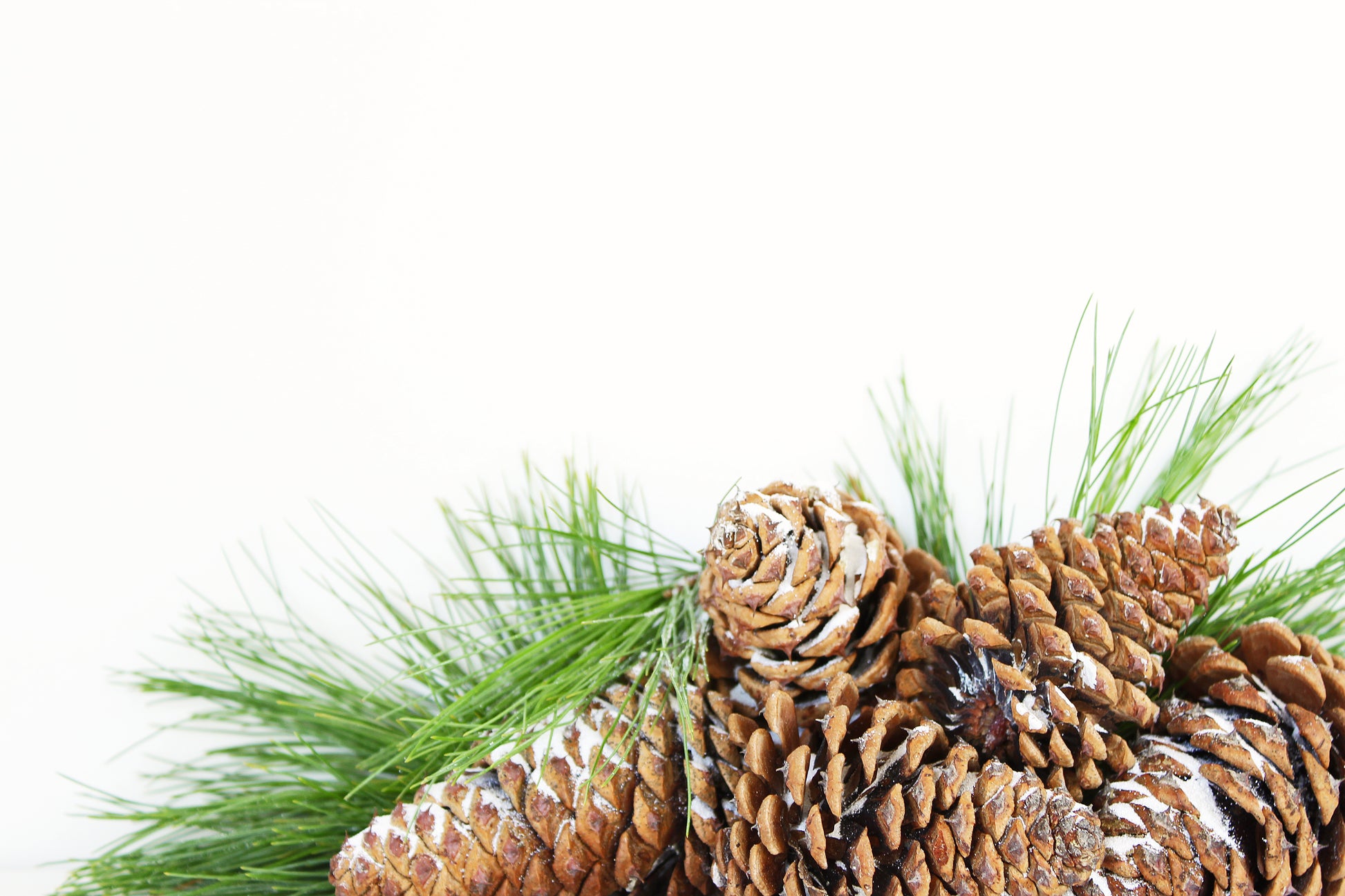 Fresh pinecones, snow and evergreen branches frame white copy space.