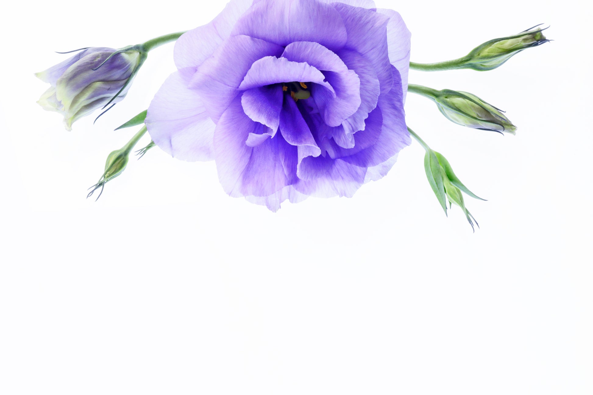 Purple Prairie Gentian flower and buds frame white copy space background.