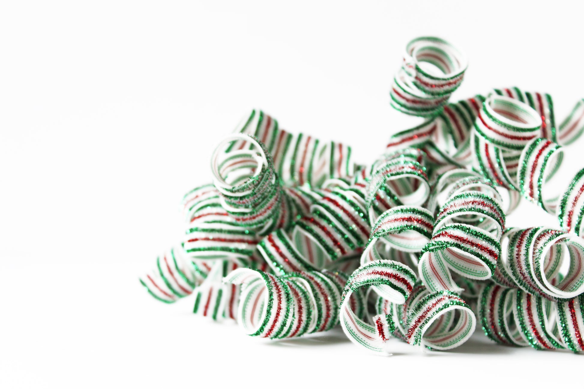 Close up view of red, white and green striped gift wrapping ribbons. White copy space.