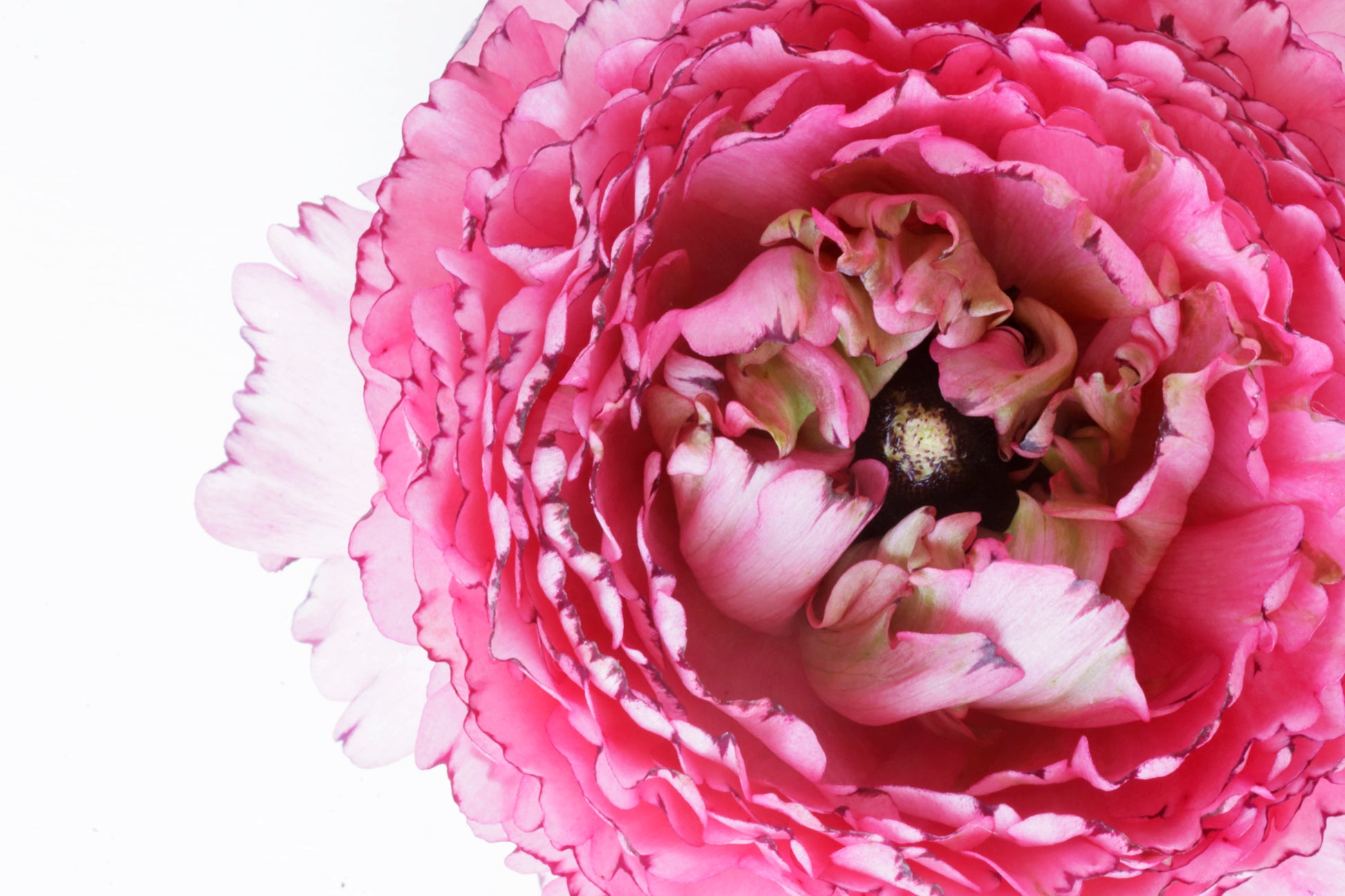 This fine art photograph features a single pink ranunculus delicately set against a clean white background, capturing the quiet beauty of simplicity. The soft, layered petals unfold in graceful spirals, showcasing the flower’s natural elegance and intricate structure. Bathed in gentle, natural light, the ranunculus appears almost ethereal—its vivid hue standing out in striking contrast to the minimal backdrop. This still life image evokes a sense of calm and purity, inviting the viewer to pause and appreciate the fleeting, delicate moments found in nature.