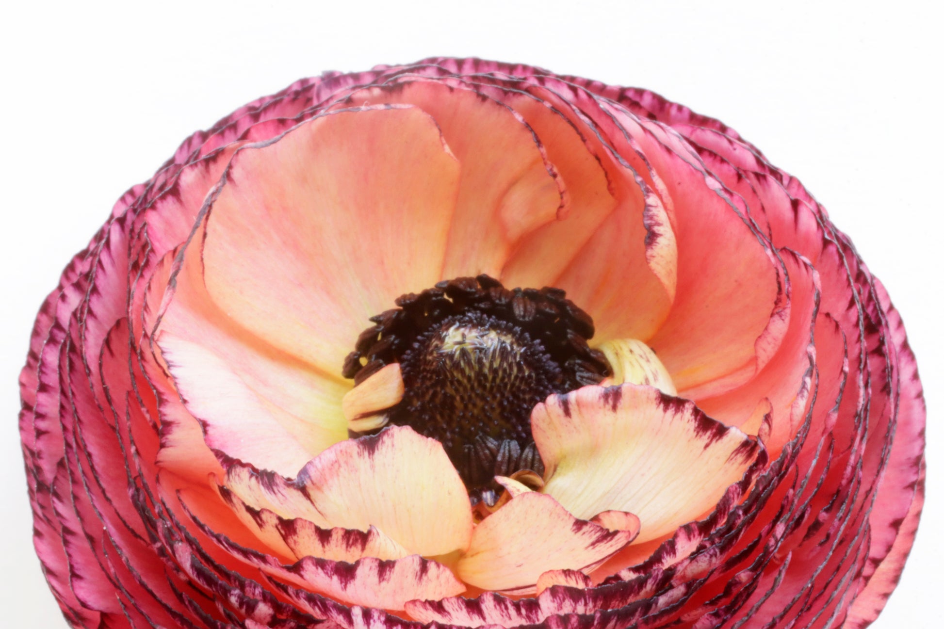 This fine art photograph features a single multicolored ranunculus delicately set against a clean white background, capturing the quiet beauty of simplicity. The soft, layered petals unfold in graceful spirals, showcasing the flower’s natural elegance and intricate structure. Bathed in gentle, natural light, the ranunculus appears almost ethereal—its vivid hue standing out in striking contrast to the minimal backdrop. This still life image evokes a sense of calm and purity, inviting the viewer to pause and appreciate the fleeting, delicate moments found in nature.