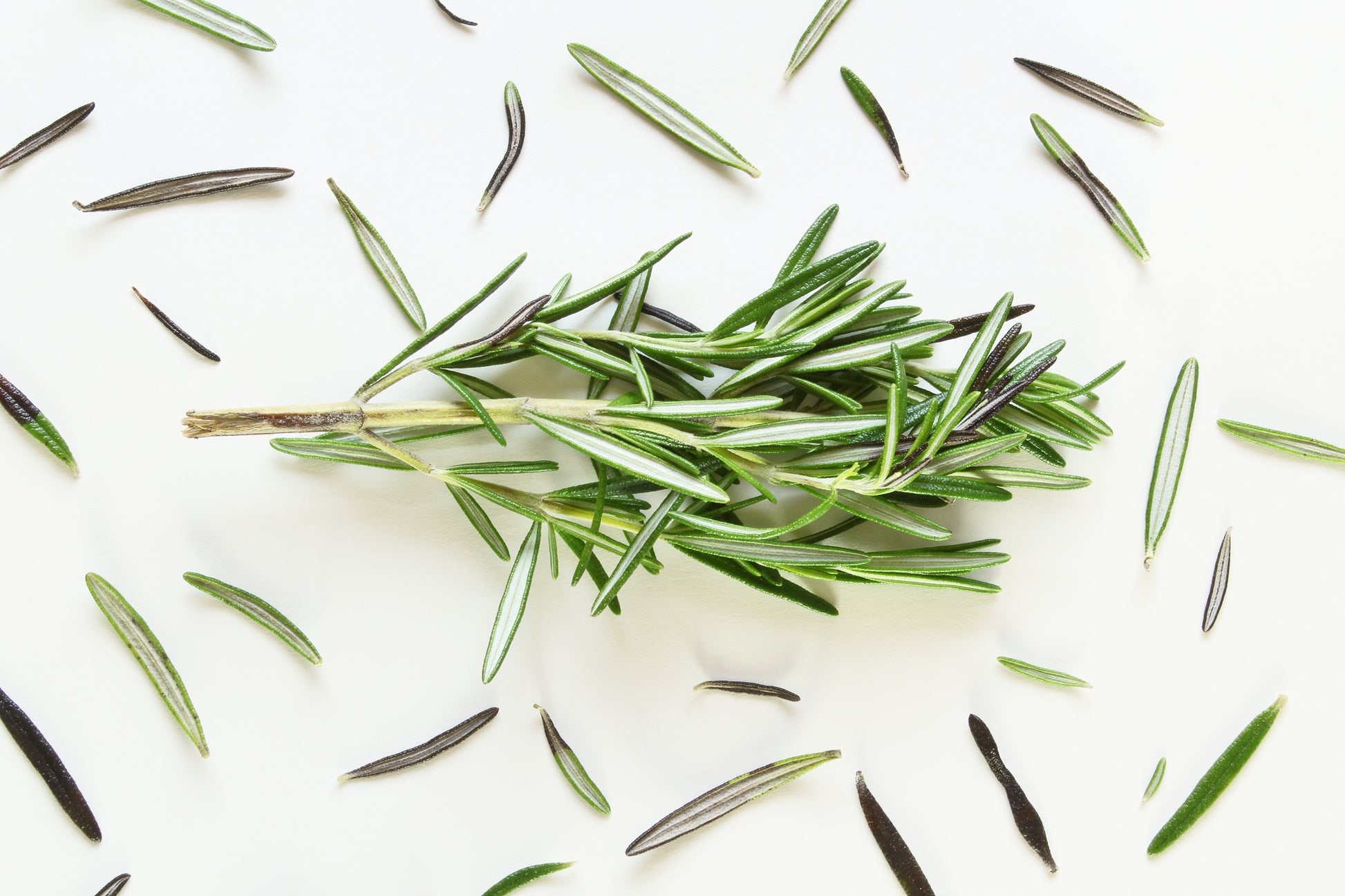 Above close up view of overhead flat lay still life of fresh rosemary on white background.