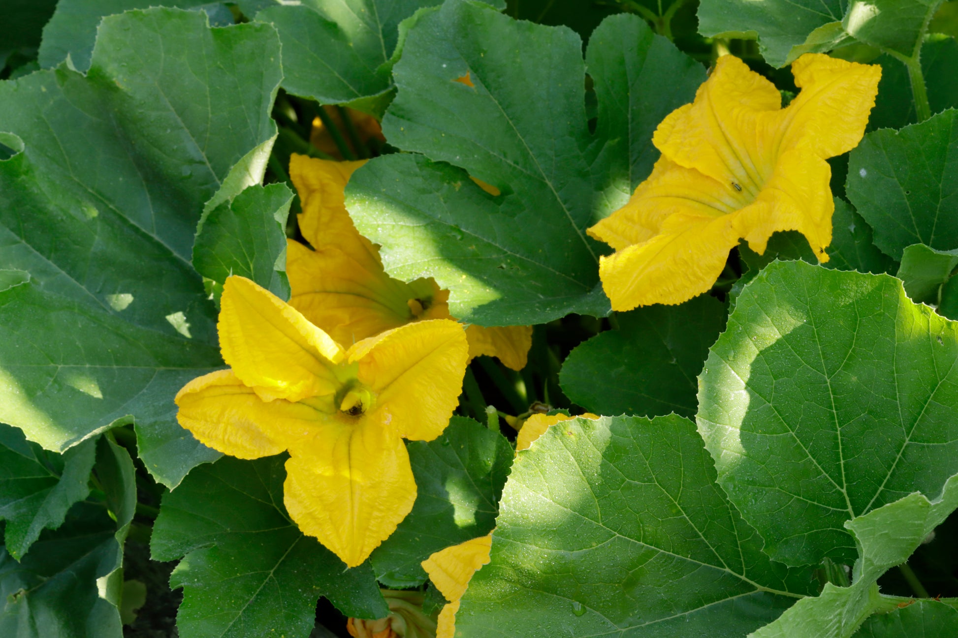 Full frame close up view of yellow squash blossoms and leaves
