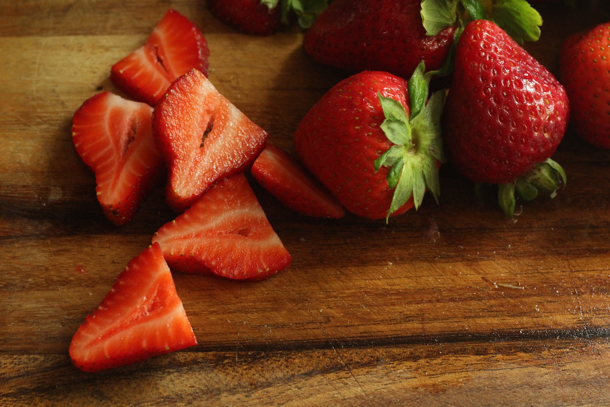 Small group of fresh strawberries sliced and whole on wood cutting board.