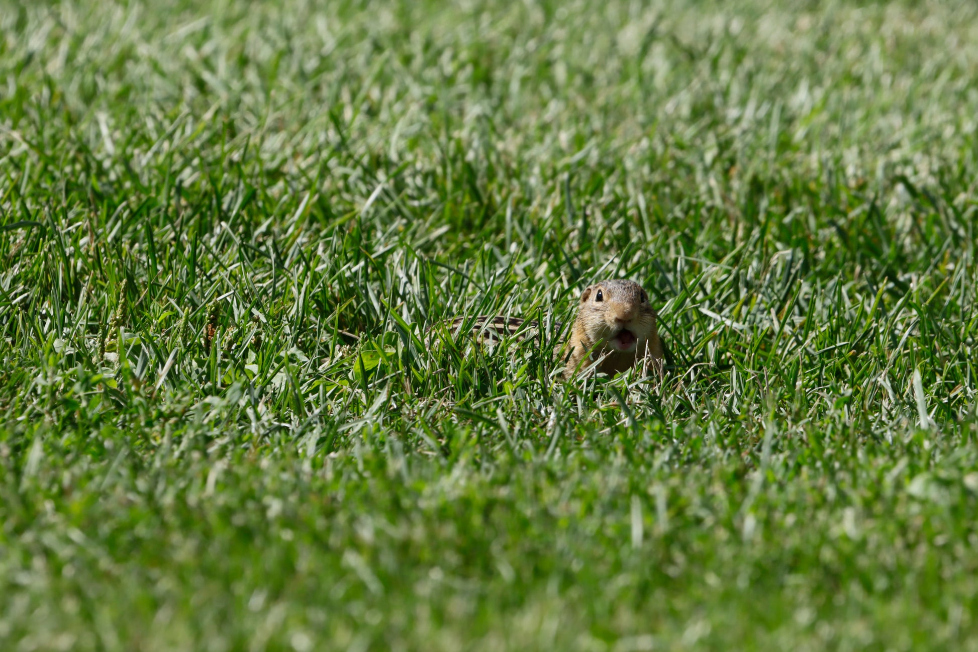 Thirteen-lined ground squirrel in the grass with his mouth open.