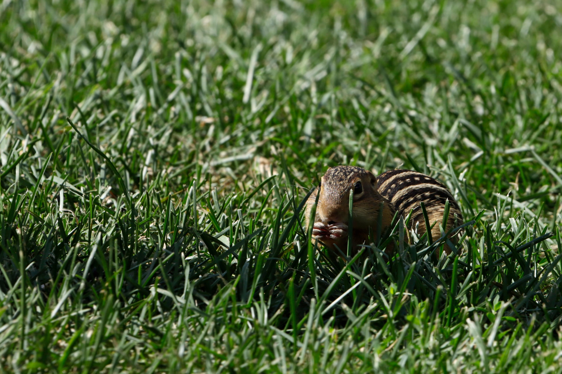 A thirteen-lined ground squirrel eating in the grass.