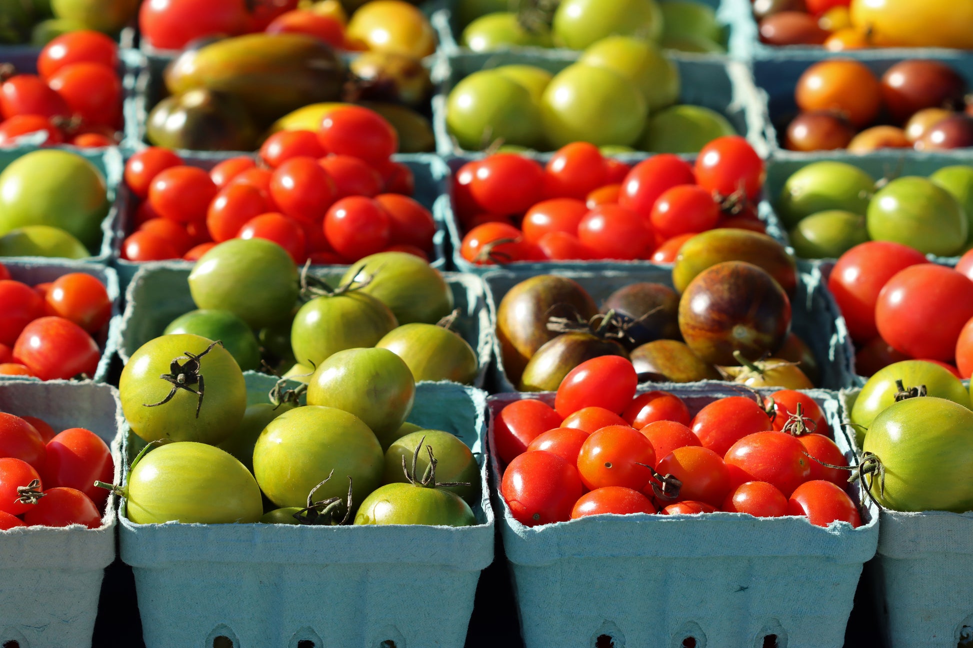 Close up view of a large group of colorful cherry tomatoes for sale at an outdoor market