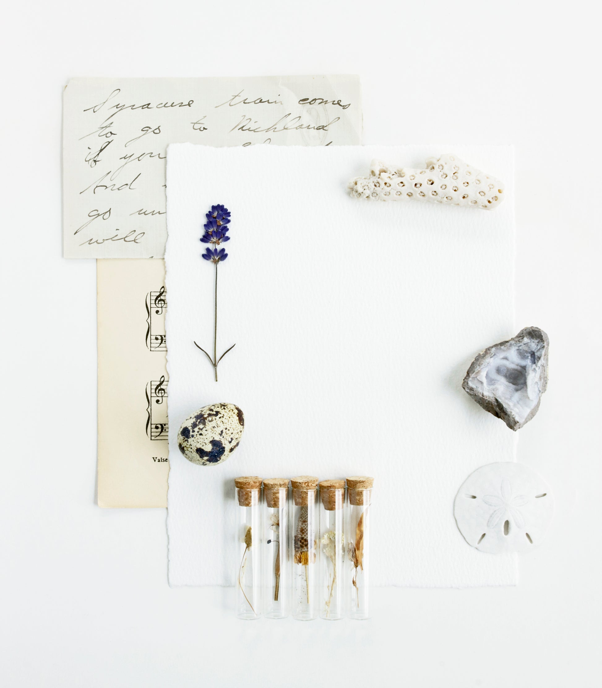 Vintage ephemera, pressed wildflowers, geode, ocean finds and quail egg on white background with hand made paper stationary.