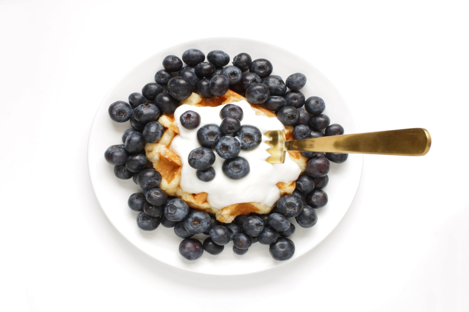Above view of a plate with belgian waffle, whipped cream and blueberries.