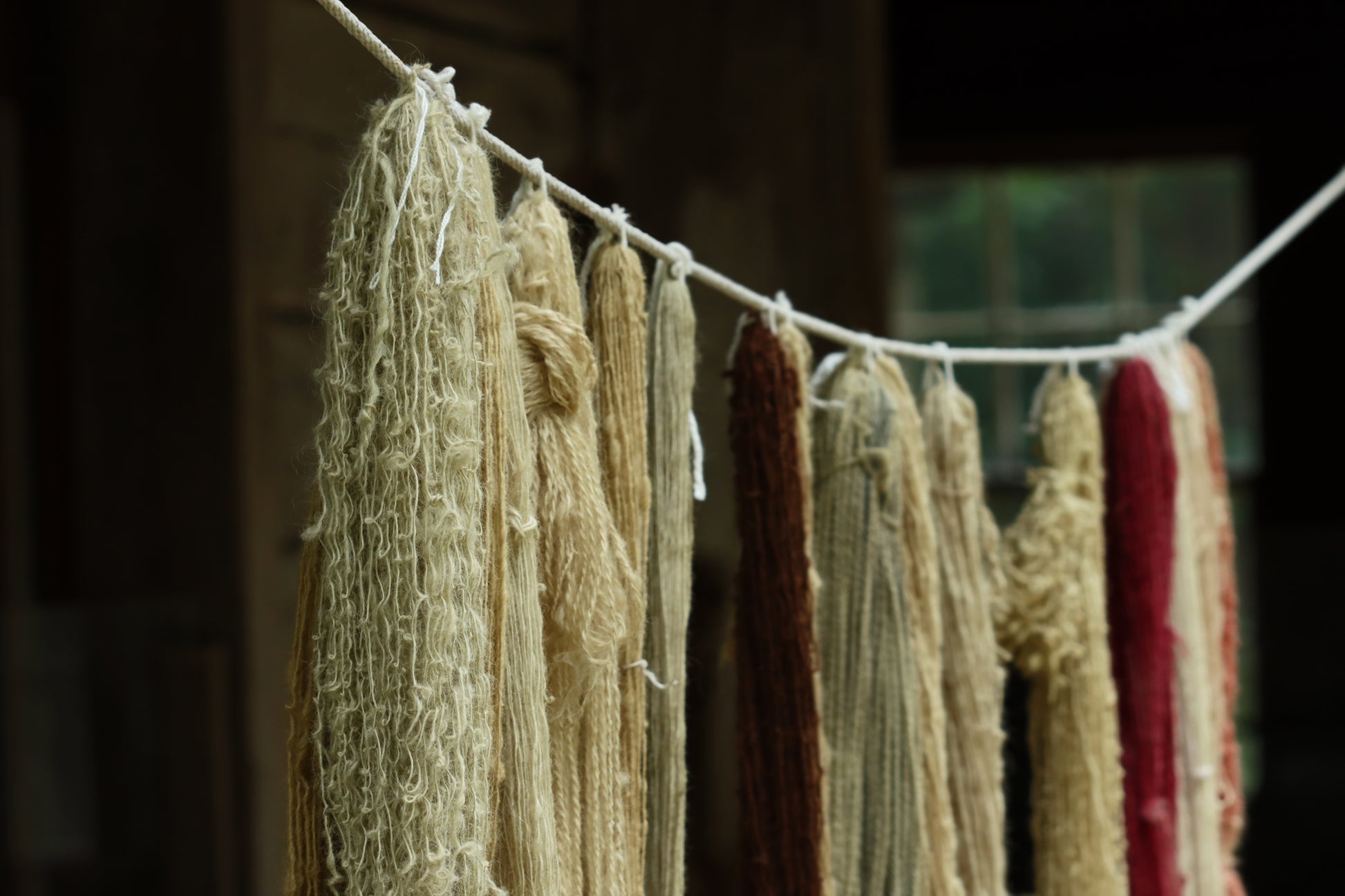 Large group of freshly dyed yarn skeins hanging to dry