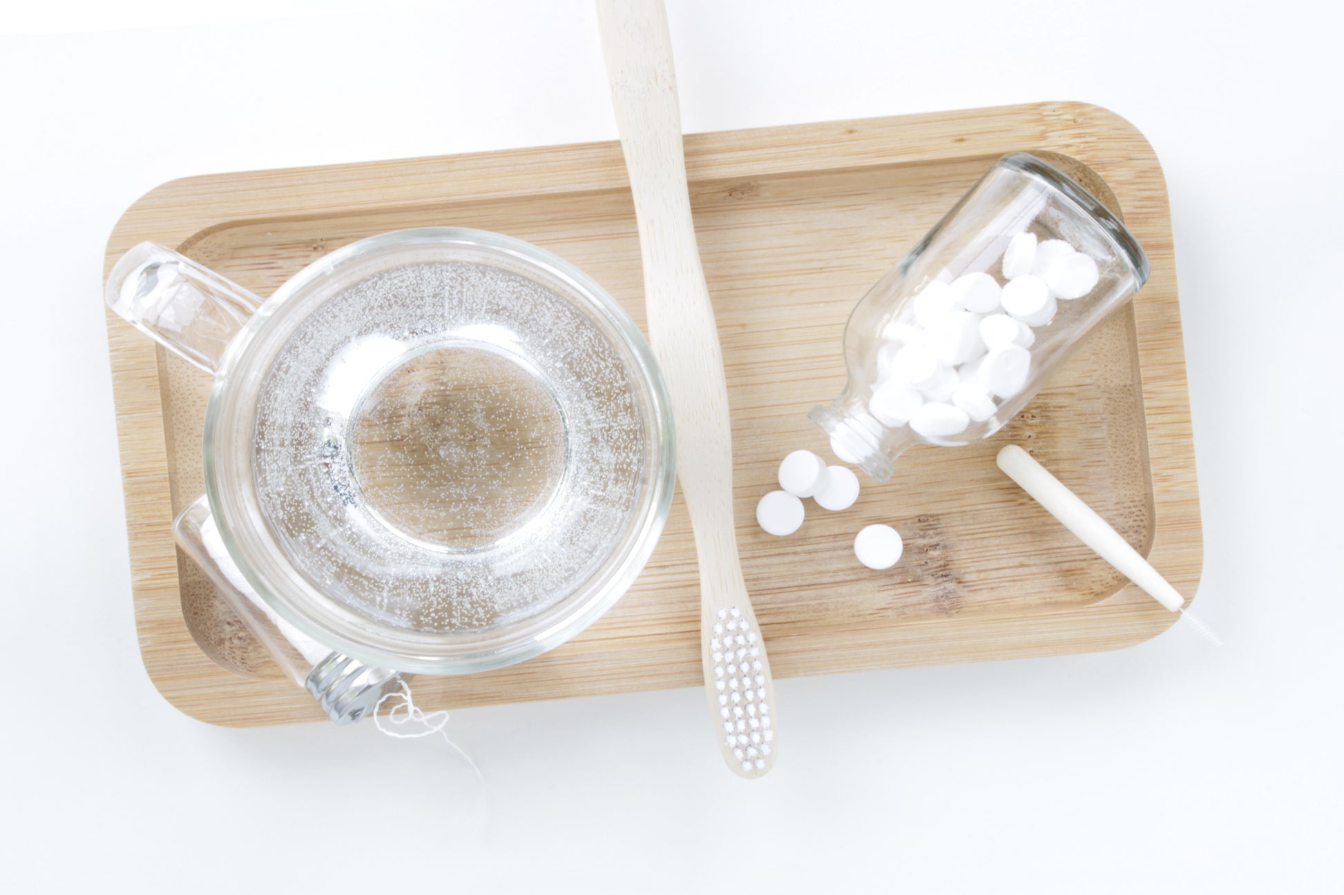 Above close up view of sustainable dental products. Bamboo toothbrush, toothpaste tablets, dental floss and a glass of water.